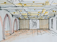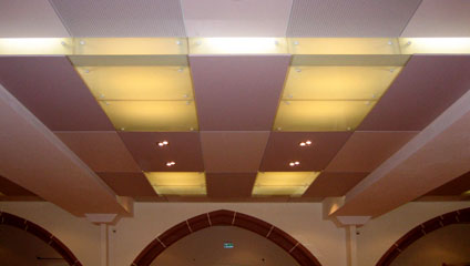 Eine neue akustisch wirksame Paneeldecke mit integrierten Lichtfeldern geben dem historischen Raum Höhe, Leichtigkeit und Eleganz zurück.